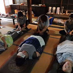 温泉入浴の後は、身近な食べ物による手当て法の時間です。生姜油の作り方と生姜湿布の実践を行いました。お腹に生姜湿布をあてると副交感神経にスイッチが入り、全身の緊張が解け、血液の流れがよくなるため、温泉に入っているような心地よい感覚に包まれます。